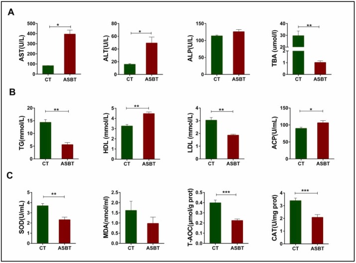 Gambar perlakuan ASBT dibandingkan kontrol (CT) memengaruhi fungsi hati, profil lipid, serta status oksidatif dengan peningkatan AST, ALT, HDL, dan ACP, penurunan TG, LDL, TBA, serta penurunan aktivitas antioksidan (SOD, T-AOC, CAT).