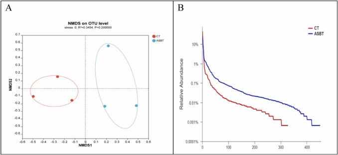 Gambar komposisi komunitas mikroba berbeda jelas antara kelompok kontrol (CT) dan ASBT (A), dengan kelompok ASBT memiliki kelimpahan relatif mikroba yang lebih tinggi dan lebih beragam dibanding CT (B).