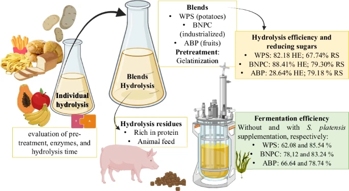 Masing-masing jenis limbah ini diproses dengan bantuan enzim seperti α-amilase, amiloglukosidase, pektinase, dan selulase. Enzim-enzim ini berfungsi memecah pati, serat, dan komponen kompleks menjadi gula sederhana yang lebih mudah difermentasi menjadi etanol.