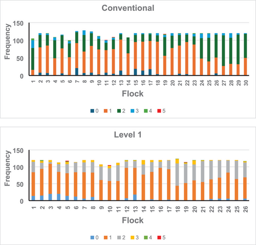Sebanyak 30 flok ayam konvensional dan 26 flok ayam kesejahteraan dievaluasi. Para peneliti menilai kemampuan berjalan ayam menggunakan skala khusus bernama Bristol gait scale, yaitu skor dari 0 (jalan normal) sampai 5 (lumpuh total).