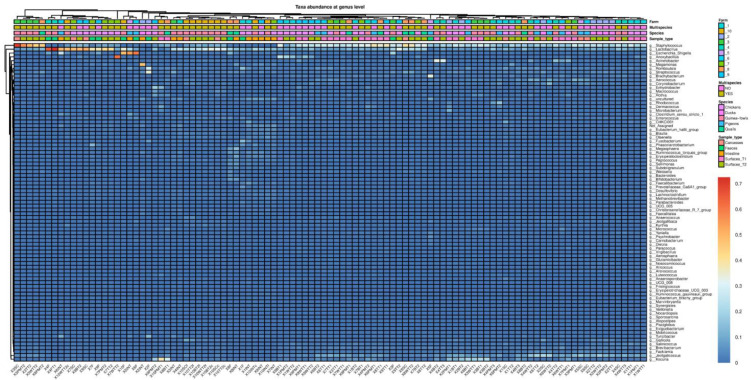 Grafik komposisi komunitas mikroba pada tingkat genus feses, permukaan, sekum, dan bangkai.