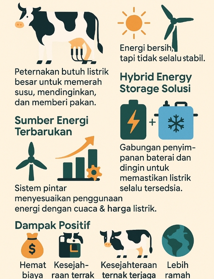 Bayangkan sebuah peternakan di masa depan: atap kandang dipenuhi panel surya, kincir angin kecil berputar di ladang, tangki susu didinginkan dengan energi yang disimpan dari siang hari, sementara aplikasi di ponsel peternak memberi tahu kapan waktu terbaik menggunakan listrik.