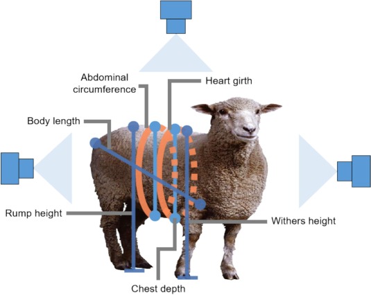 Gambar penggunaan kamera untuk mengukur parameter morfometri domba seperti panjang badan, lingkar perut, lingkar dada, tinggi punggung, tinggi pinggul, dan kedalaman dada secara non-invasif.