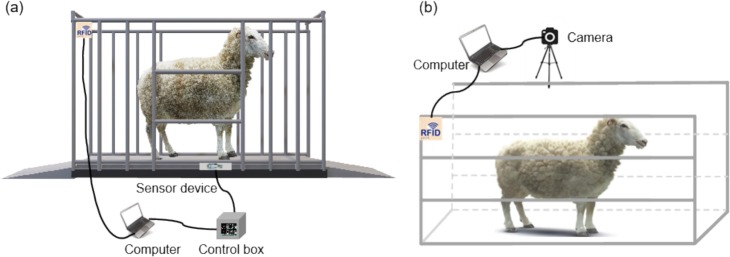 Gambar sistem pemantauan domba menggunakan RFID, sensor, dan kamera yang terhubung ke komputer untuk mengukur serta merekam data tubuh dan kondisi hewan secara otomatis.