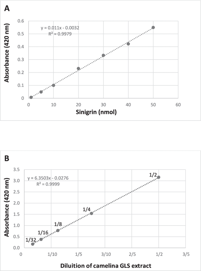 Uji Pd memiliki hubungan linear yang sangat kuat antara absorbansi dengan peningkatan konsentrasi sinigrin maupun dengan berbagai tingkat pengenceran ekstrak camelina GLS.