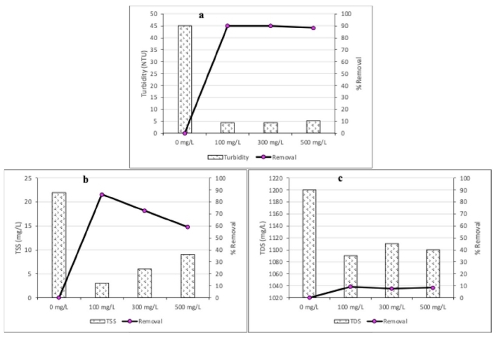 Hasilnya cukup mengesankan. Dengan dosis 100 mg/L, kekeruhan bisa berkurang hingga 87–90%, TSS turun 72–86%, dan TDS berkurang hingga 9%. Artinya, air kolam jadi jauh lebih jernih dan sehat untuk ikan.