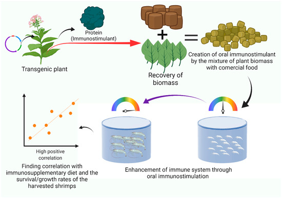 Contoh representatif alur kerja melalui produksi, pemberian, dan evaluasi imunologi imunostimulan rekombinan buatan tanaman dalam kultur udang.