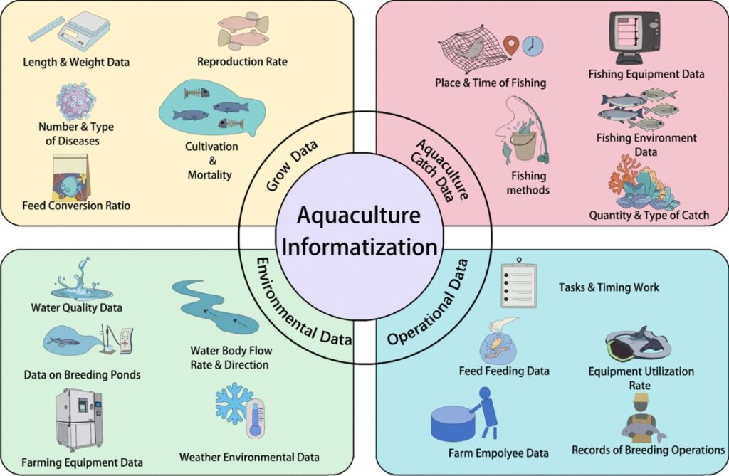 Aquaculture Informatization (informatika akuakultur) mencakup pengumpulan dan pengelolaan empat jenis data utama: Grow Data, Aquaculture Catch Data, Environmental Data, dan Operational Data untuk memantau pertumbuhan, hasil tangkapan, kondisi lingkungan, serta operasional budidaya ikan secara terintegrasi.