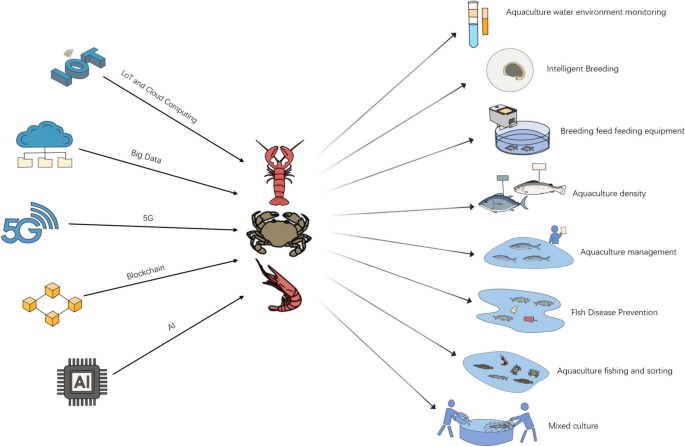 Penerapan teknologi modern seperti IoT, Big Data, 5G, Blockchain, dan AI dalam akuakultur untuk mendukung pemantauan lingkungan, pembiakan cerdas, manajemen budidaya, pencegahan penyakit, hingga panen dan kultur campuran.