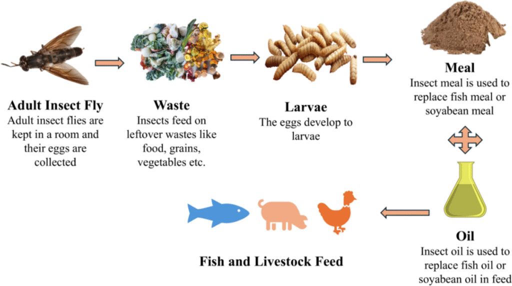 Siklus produksi pakan dari lalat BSF, di mana lalat dewasa bertelur, larva diberi makan limbah makanan, lalu diolah menjadi tepung dan minyak serangga yang dapat menggantikan tepung ikan/kedelai serta minyak ikan/kedelai untuk pakan ikan dan ternak.