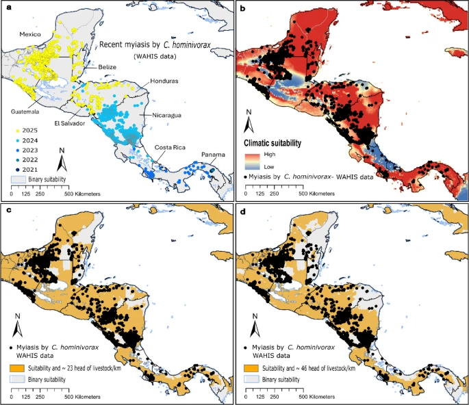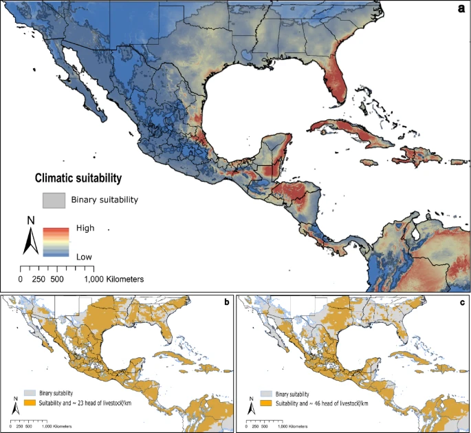 Valdez-Espinoza, Uriel Mauricio dkk. 2025. The reemergence of the New World screwworm and its potential distribution in North America. Scientific Reports 15 (1), 23819.