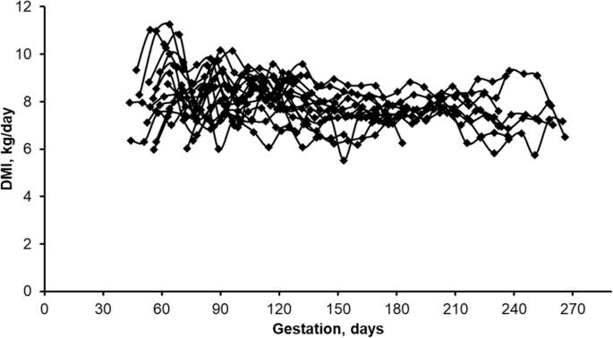 Semua sapi diberi pakan berupa silase jagung plus suplemen berbasis protein. Peneliti kemudian memantau konsumsi pakan, berat badan, serta parameter pencernaan pada hari ke-107, 170, 208, 240, 267, dan 286 masa kebuntingan (DOP = Days of Pregnancy).