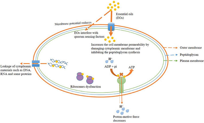 Mekanisme antibakteri minyak esensial (EOs) yang bekerja dengan merusak membran sel, meningkatkan permeabilitas, menghambat sintesis peptidoglikan, mengganggu ribosom dan produksi ATP, serta menyebabkan kebocoran DNA, RNA, dan protein.