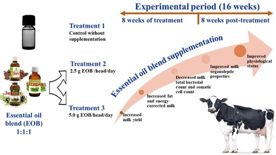 Suplementasi essential oil blend (EOB) pada sapi selama 8 minggu meningkatkan produksi dan kualitas susu, menurunkan jumlah bakteri dan sel somatik, serta memperbaiki status fisiologis dibandingkan kontrol tanpa suplementasi.