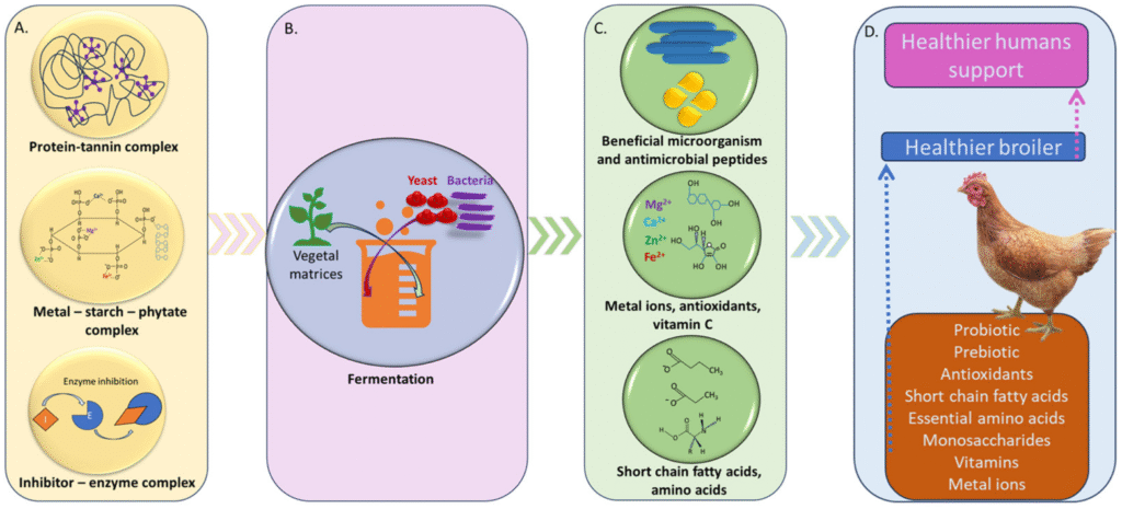 Fermentasi matriks nabati oleh ragi dan bakteri dapat memecah kompleks anti-nutrisi menjadi senyawa bermanfaat seperti probiotik, prebiotik, asam lemak rantai pendek, asam amino esensial, vitamin, dan ion mineral yang meningkatkan kesehatan broiler serta secara tidak langsung mendukung kesehatan manusia.