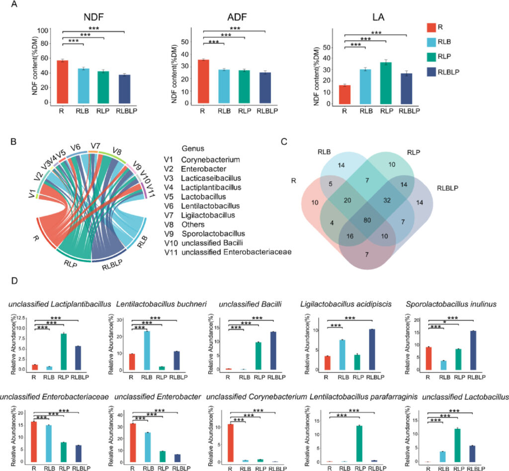 Komposisi komunitas mikroba pada silase pakan yang diinokulasi bakteri asam laktat (LAB), termasuk perbedaan kandungan serat, asam organik, serta variasi spesies dominan berdasarkan perlakuan campuran hijauan dan jagung atau sorgum-sudangrass.