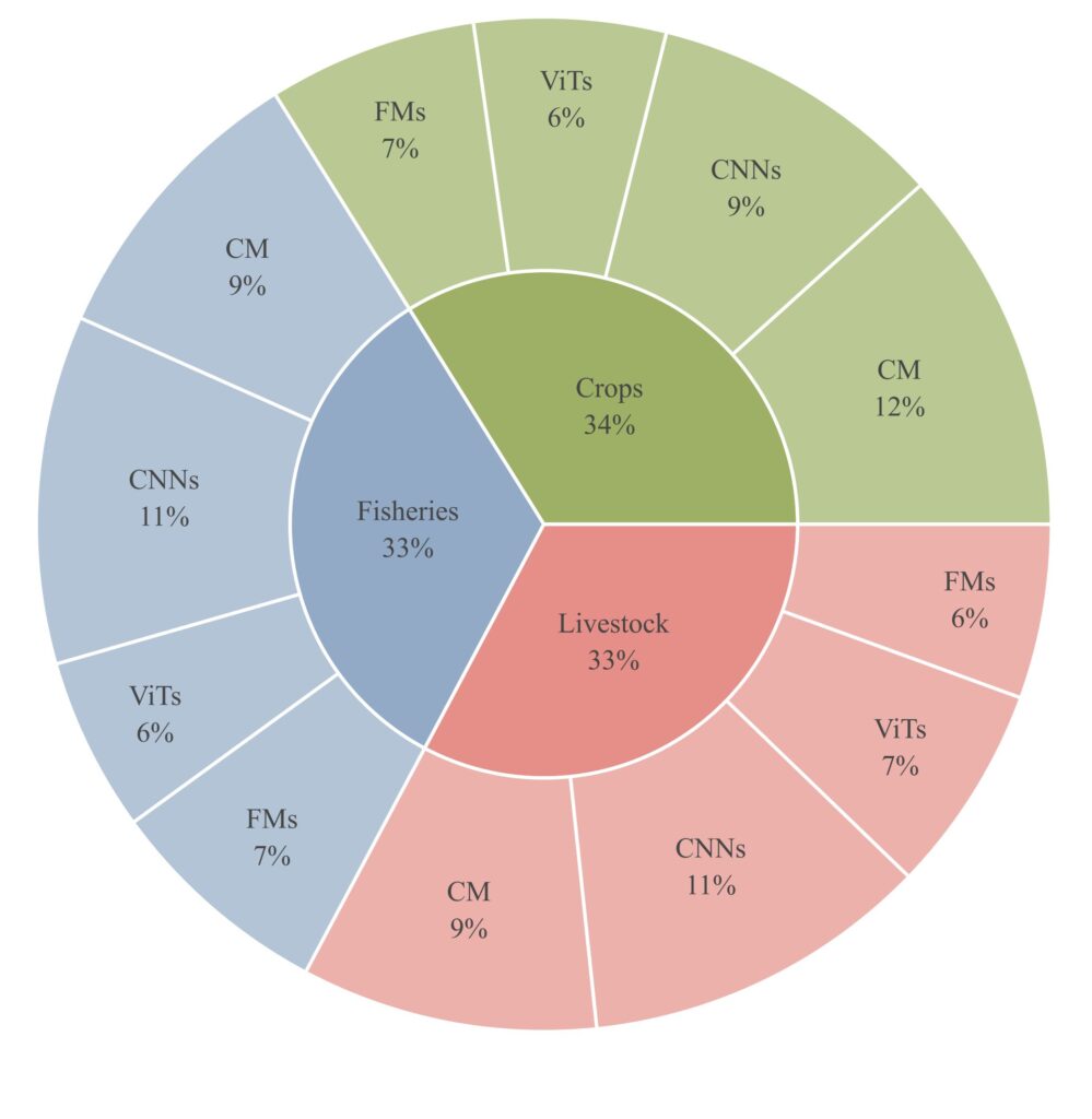 Diagram proporsi penerapan teknologi AI pada sektor pertanian, perikanan, dan peternakan, di mana ketiganya hampir seimbang (sekitar 33–34%) dengan kontribusi terbesar berasal dari metode CNN, CM, ViTs, dan FMs.