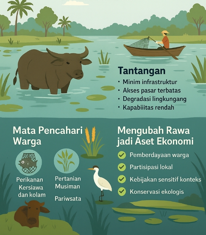 Namun, potensi itu tidak bisa digarap maksimal tanpa dukungan infrastruktur, kebijakan, pelestarian lingkungan, dan pemberdayaan masyarakat. Dengan strategi tepat, rawa bisa berubah menjadi aset ekonomi berkelanjutan yang mendukung kesejahteraan lokal sekaligus menjaga lingkungan.