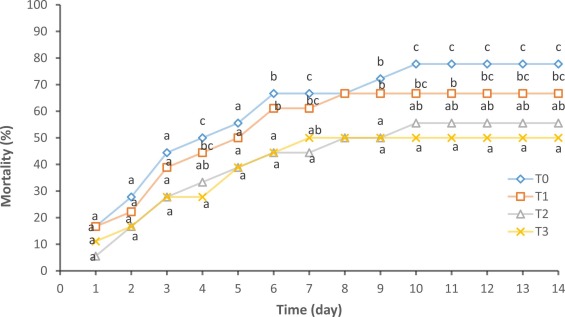 Grafik suplementasi rosmarinic acid dan Bacillus subtilis dalam pakan ikan mas (Cyprinus carpio) menurunkan mortalitas akibat infeksi Aeromonas hydrophila, dengan kelompok T2 dan T3 memiliki tingkat kelangsungan hidup lebih tinggi dibandingkan kontrol (T0).