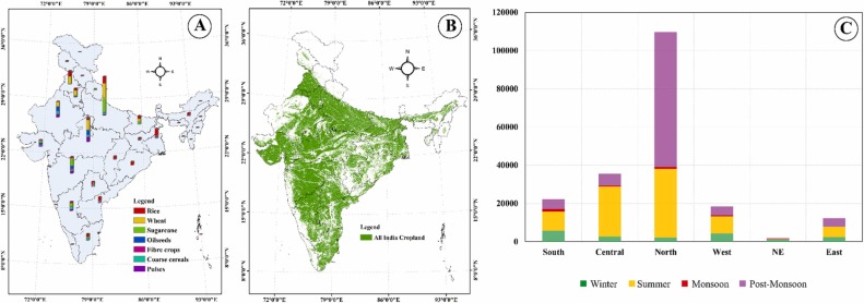 Gambar ini menunjukkan distribusi jenis tanaman utama di India (A), sebaran lahan pertanian nasional (B), dan kontribusi musiman dari berbagai wilayah terhadap aktivitas pertanian dengan dominasi produksi di India Utara (C).