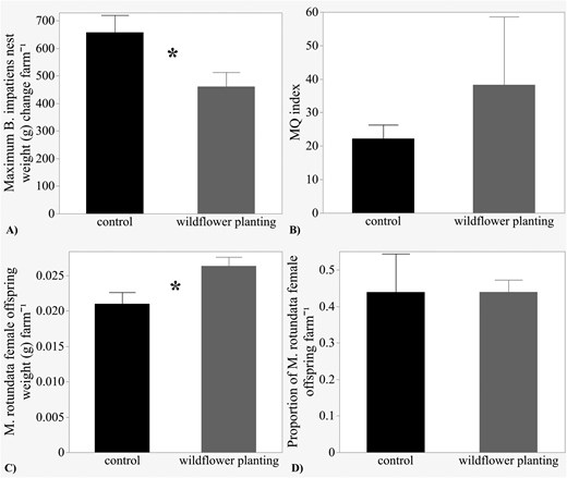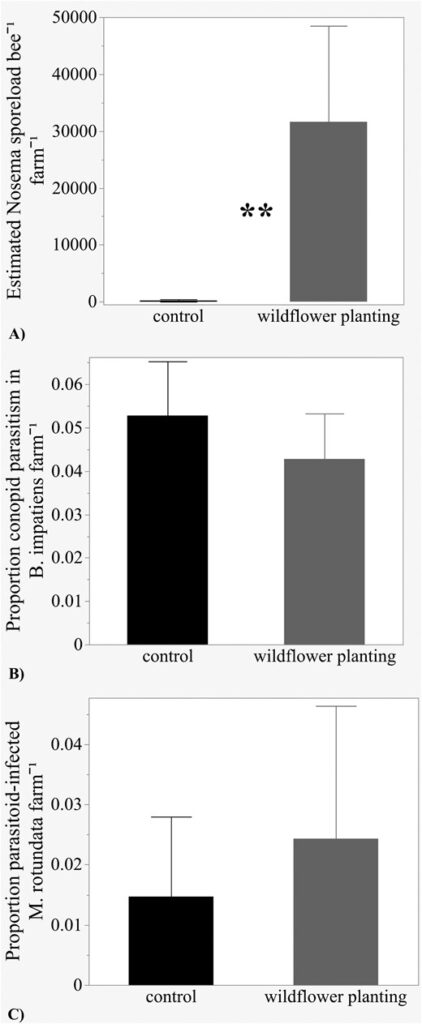 Koloni yang ditempatkan di lahan dengan bunga liar justru cenderung lebih kecil dan menghasilkan pekerja dengan berat badan lebih rendah. Lebih dari itu, lebah betina pekerja ditemukan terinfeksi spora Nosema, sejenis mikrosporidia (parasit mikroskopis), dalam jumlah yang jauh lebih tinggi di lahan dengan bunga liar dibandingkan lahan tanpa bunga liar. - Untuk lebah soliter (Megachile rotundata):