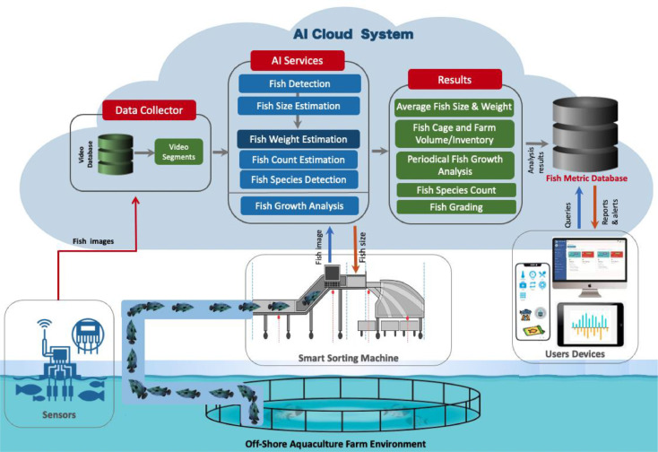 Gambar sistem akuakultur lepas pantai berbasis AI cloud yang menggunakan sensor dan video untuk mendeteksi, menghitung, mengukur, serta menganalisis pertumbuhan ikan sehingga hasilnya dapat dipantau melalui database dan perangkat pengguna.