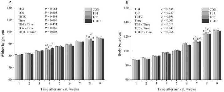 - Eksperimen 1: 24 pedet jantan baru lahir (usia 1 hari, berat rata-rata 0,9 kg) diberi susu pengganti dengan atau tanpa tambahan TB4 dan TC6.
