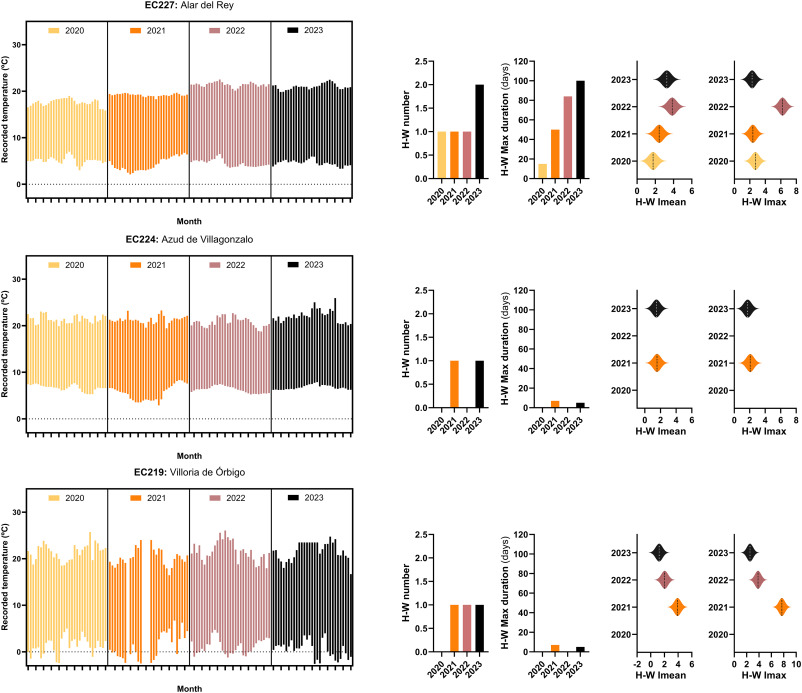Variasi suhu air rata-rata, jumlah dan durasi gelombang panas, serta intensitas rata-rata dan maksimum gelombang panas di tiga lokasi (EC219, EC224, EC227) selama tahun 2020–2023.