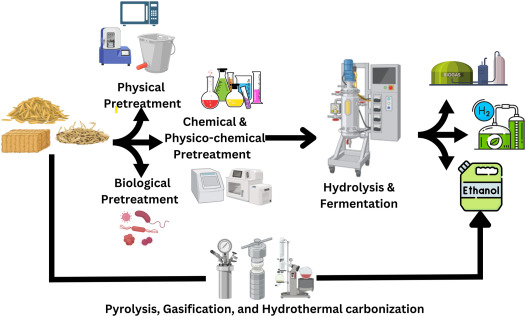 Alur konversi biomassa pertanian melalui berbagai tahap praperlakuan fisik, kimia, dan biologis yang dilanjutkan dengan hidrolisis, fermentasi, atau proses termokimia untuk menghasilkan bioenergi seperti etanol, hidrogen, dan biogas (Suryawanshi, dkk. 2026).