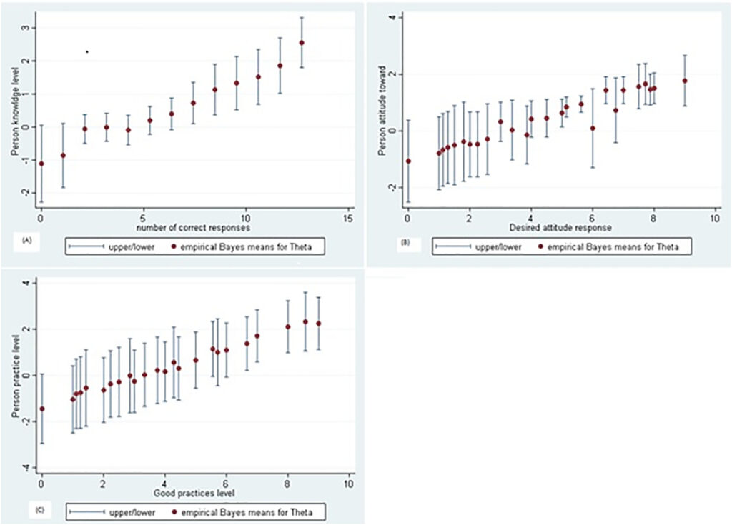 Grafik ini menunjukkan bahwa semakin banyak jawaban benar atau semakin tinggi skor sikap dan praktik responden, maka semakin tinggi pula tingkat pengetahuan, sikap, dan praktik yang diprediksi secara statistik, dengan pola hubungan yang konsisten dan meningkat (Yizengaw, dkk. 2026).