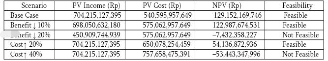 Hasilnya menunjukkan bahwa pengembangan peternakan sapi berbasis ekowisata di lahan bekas tambang layak secara ekonomi. Investasi awal yang mencakup pembangunan infrastruktur, pengadaan ternak, dan biaya operasional dapat tertutupi oleh pendapatan yang dihasilkan dalam jangka waktu yang wajar.