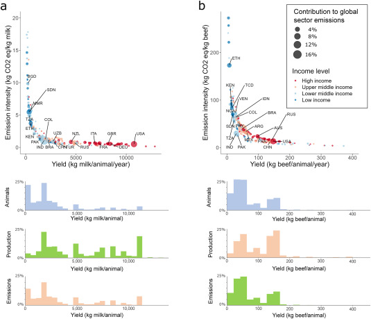 Grafik ini menunjukkan bahwa negara dengan produktivitas sapi yang lebih tinggi cenderung memiliki intensitas emisi gas rumah kaca per kilogram susu atau daging yang lebih rendah, sehingga peningkatan efisiensi produksi dan pengurangan jumlah ternak dapat menurunkan emisi global sektor peternakan (Fischer & Herrero, 2026).