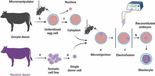 Proses kloning ternak tanpa zona pelusida, yaitu dengan memindahkan inti sel tubuh ternak unggul ke sel telur yang intinya telah diambil, lalu menyatukannya secara listrik hingga berkembang menjadi embrio baru (Herrid & Eenennaam, 2026).